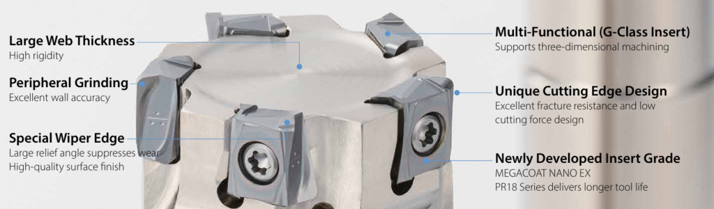 Kyocerina serija rezkarjev MA90 zagotavlja togo in visoko učinkovito delovanje v širokem naboru operacij, vključno z klančastim, vijačnim rezkanjem in žepnim rezkanjem. S 4-rezalnimi tangencialnimi ploščicami in edinstvenim rezalnim robom s perifernim brušenjem MA90 izboljša natančnost stene, odpornost proti tresljajem in površinsko obdelavo. Kvalitete ploščic MEGACOAT NANO EX serije PR18 zagotavljajo dolgo in stabilno življenjsko dobo orodja z odlično odpornostjo proti obrabi, medtem ko stopničasta zasnova brisalnega roba zavira abrazijo in zmanjšuje rezalno silo. Serija MA90 se odlično odreže v nastavitvah, ki zahtevajo stabilnost obdelave, natančnost in končno obdelavo. Od delov kalupov do komponent zavor MA90 ponuja podaljšano življenjsko dobo orodja, prilagodljivost obdelave in zanesljivo kakovost za današnja visoko mešana in zahtevna okolja.